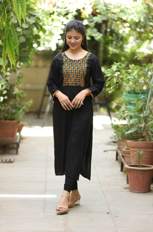 Women's Rayon Round Neck 3/4 Sleeve Embroderied A line Kurta for Party Office Everyday